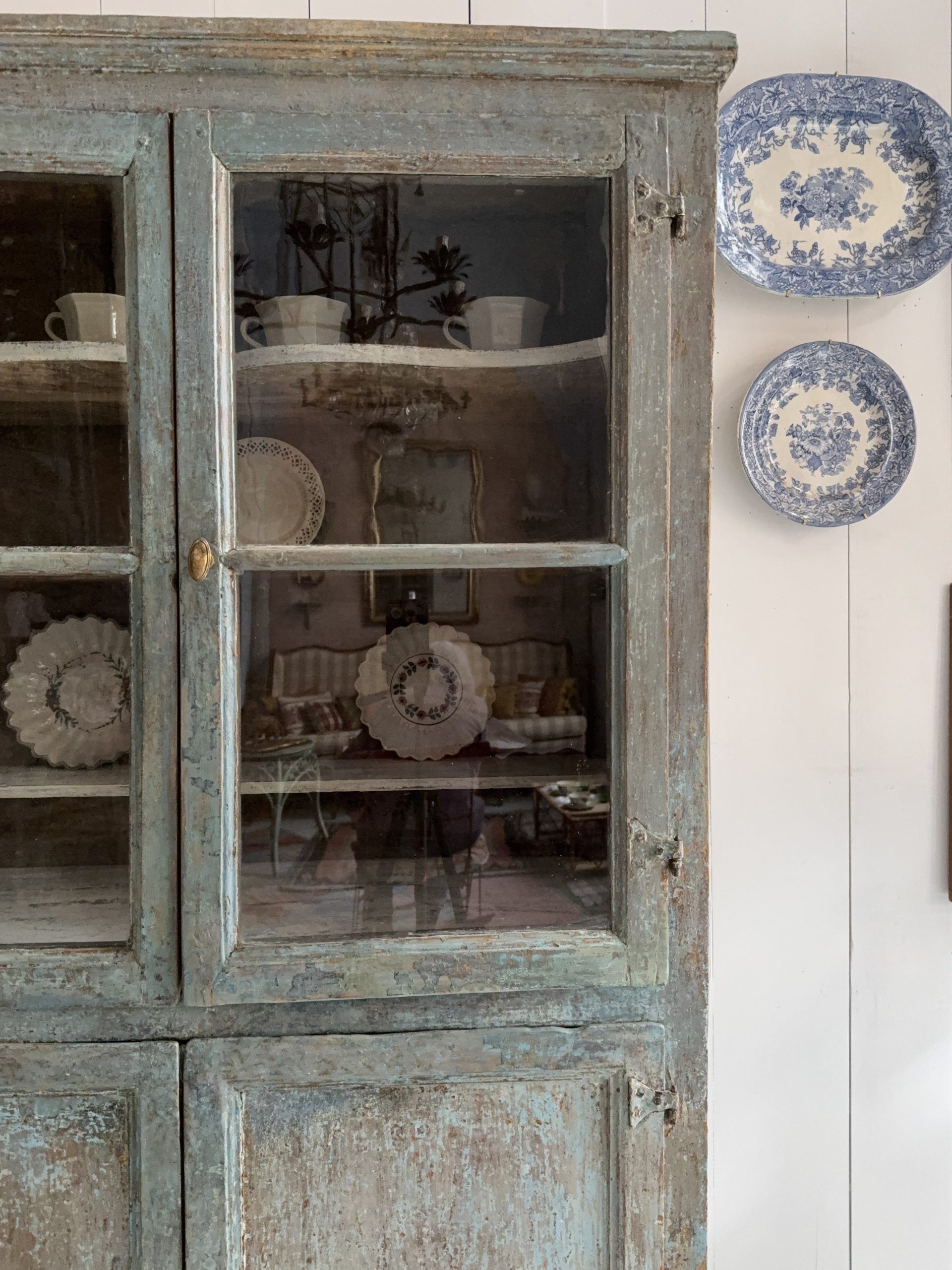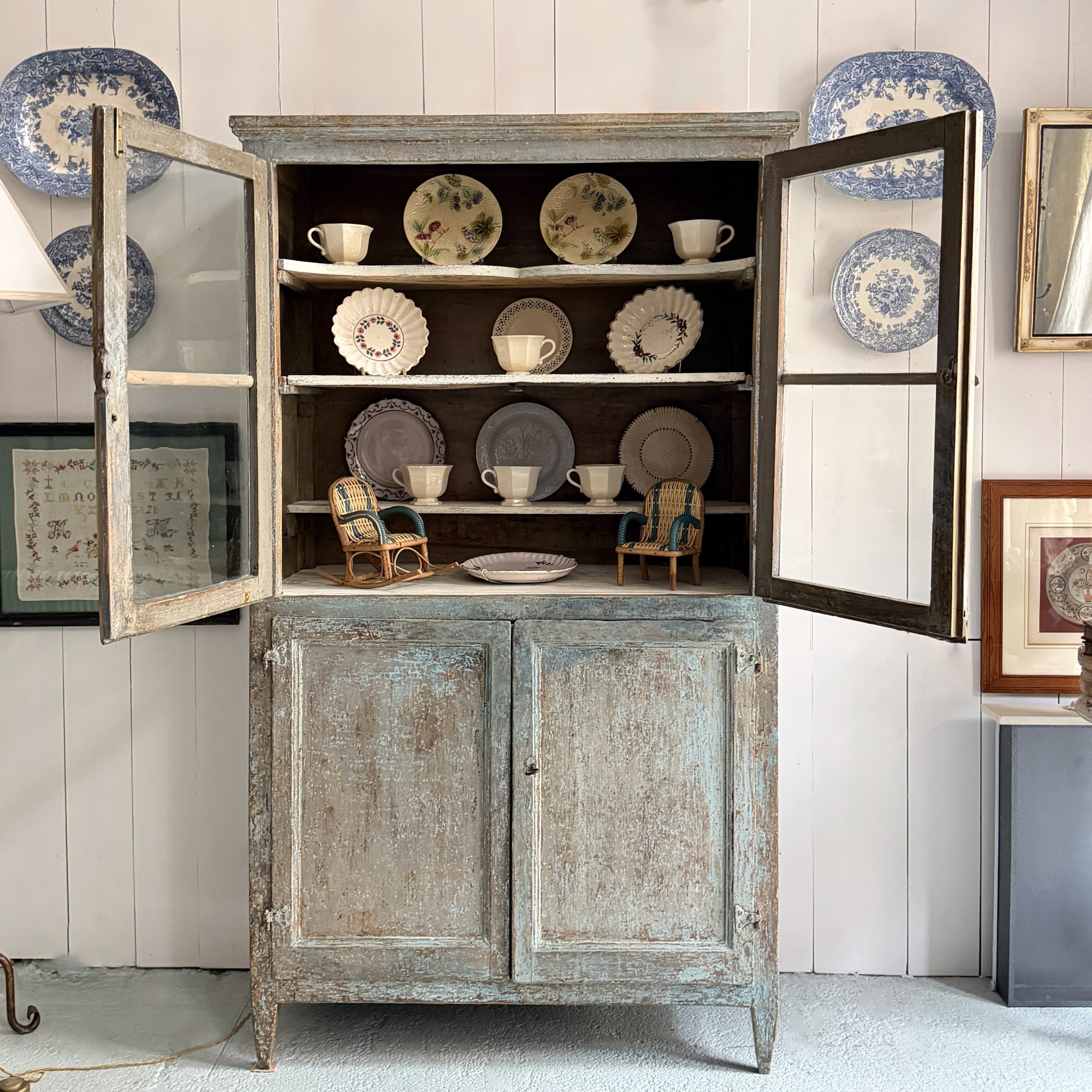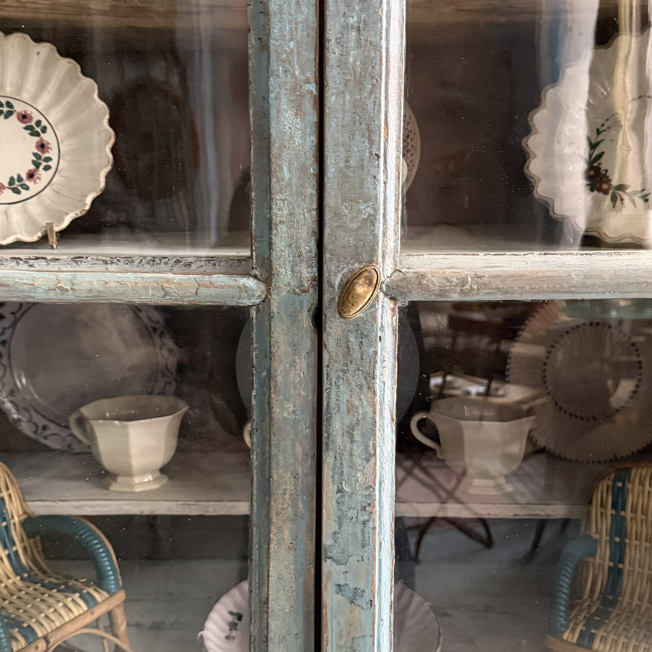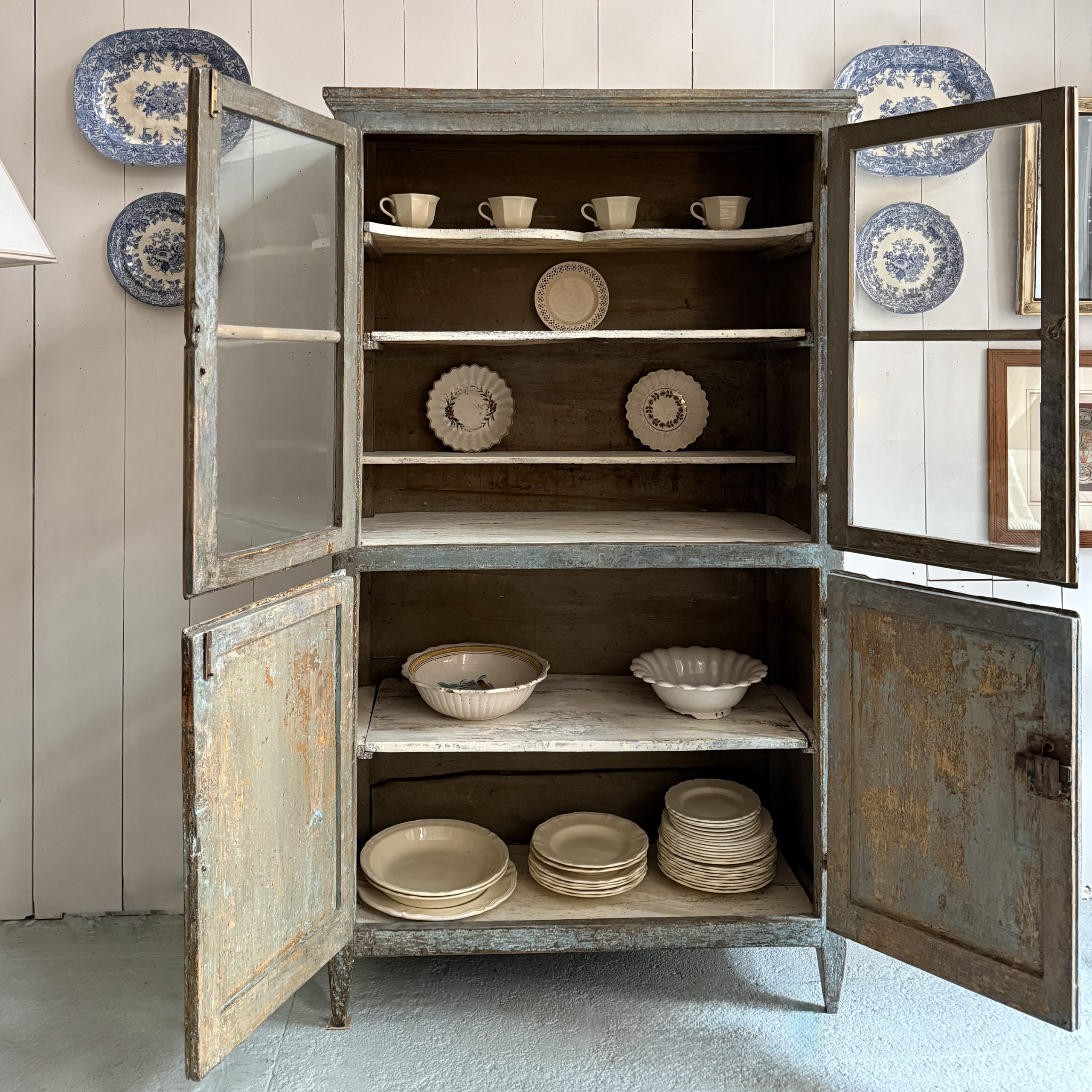 Piccola credenza azzurra di epoca Direttorio con i suoi vetri soffiati originali, sei ripiani in totale.