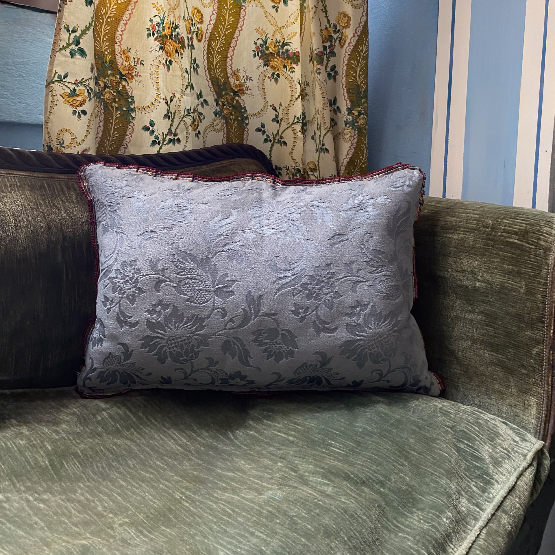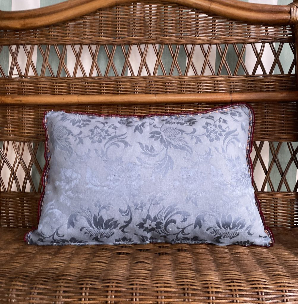 Cuscino ottomano giallo e azzurro, con tessuto vintage in seta stampata Ikat.