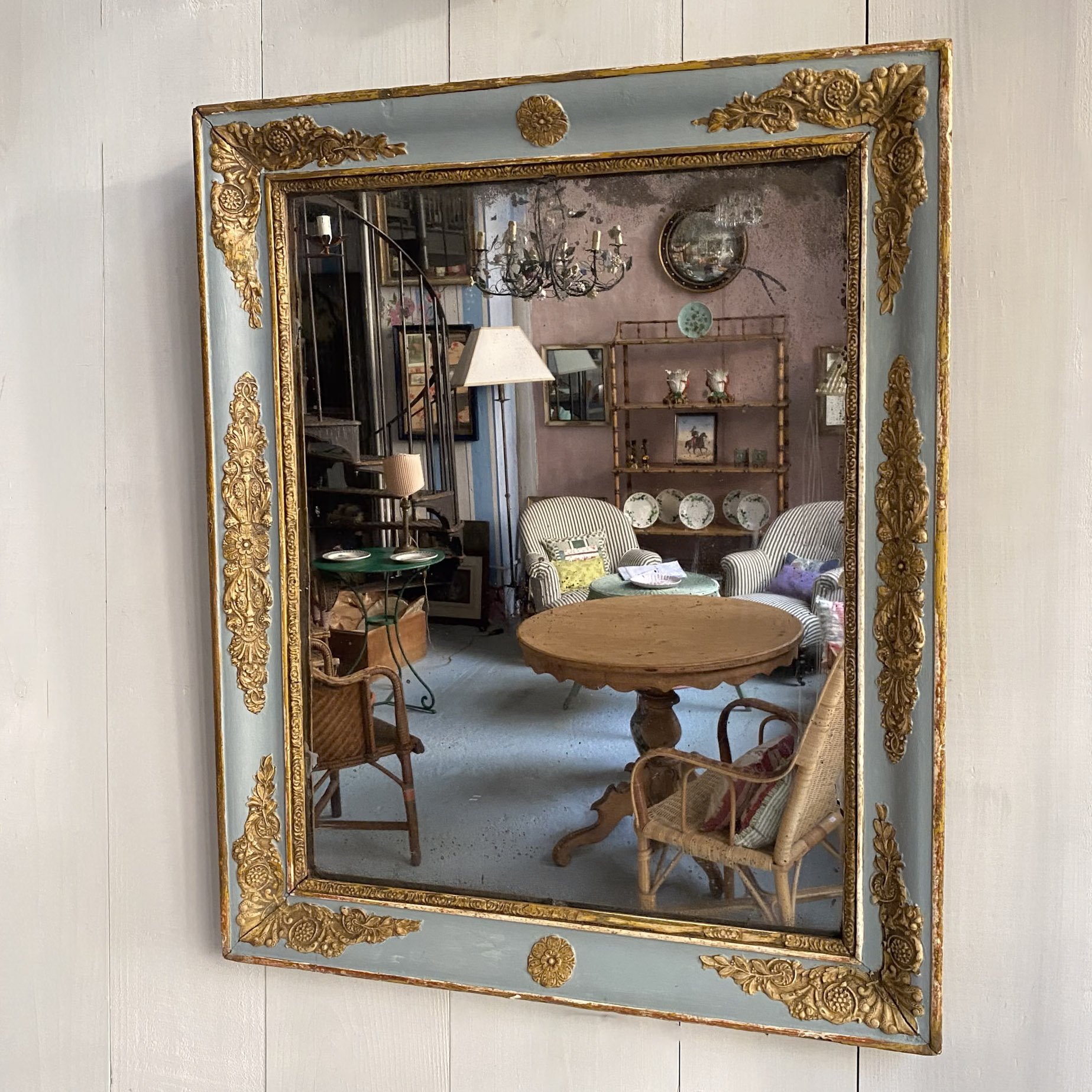 Specchio Impero laccato azzurro e oro.
